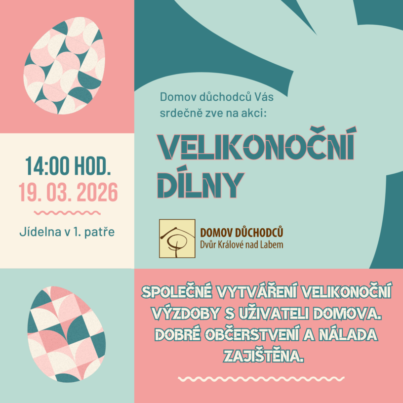 Srdečně zveme rodinné příslušníky, kamarády a známé na tradiční Velikonoční dílny, které se budou konat ve čtvrtek 19. 3. 2026 od 14 hodin u nás v Domově důchodců. Těšit se můžete na společné vytváření velikonoční výzdoby a dobré občerstvení.